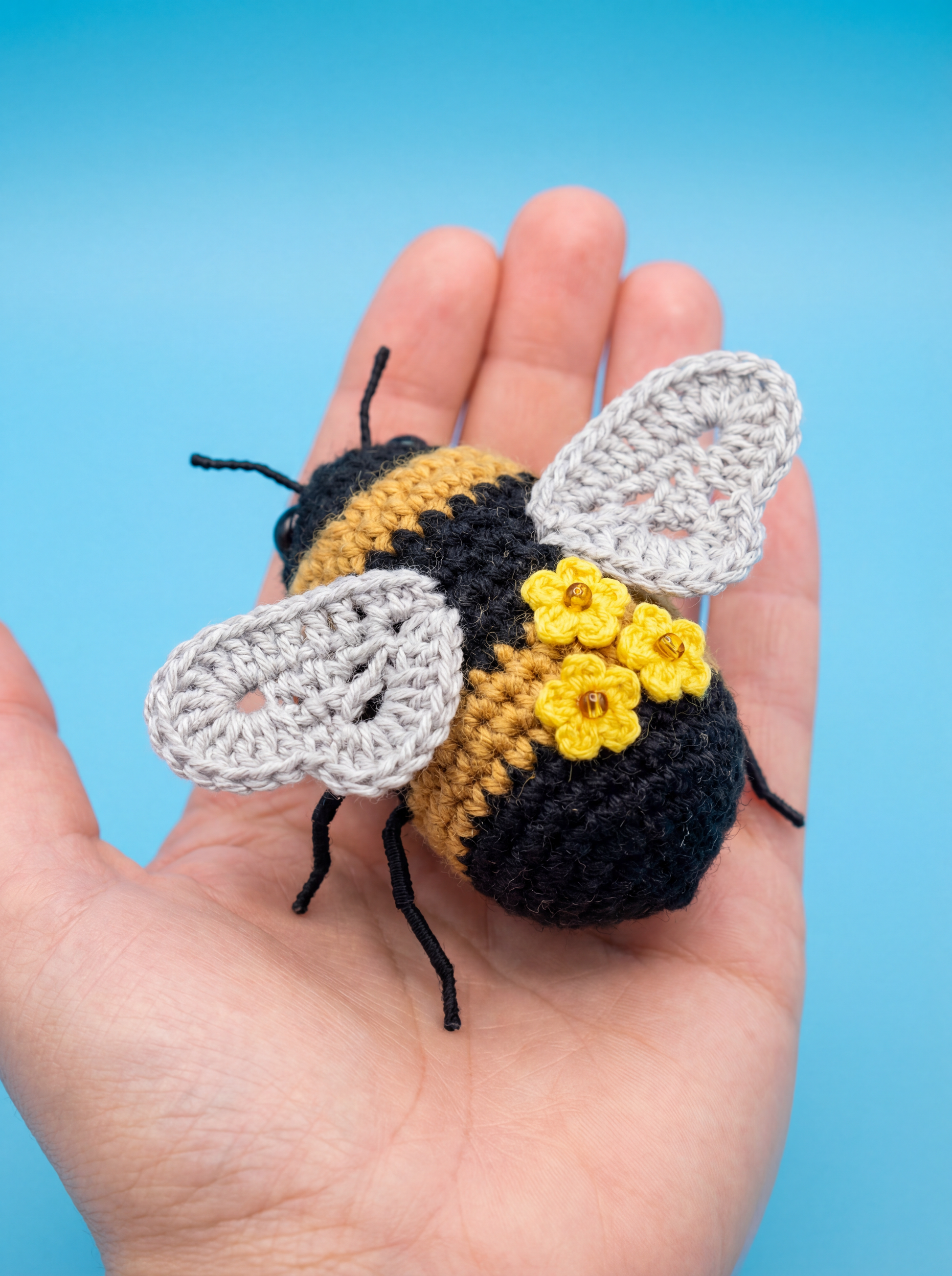 This premium crochet pattern guides you through creating a charming, detailed bee adorned with delicate micro-flowers and amber beads.